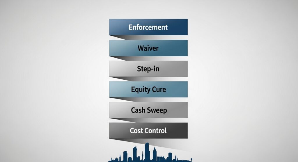 We document a clear order of operations so a wobble does not become a default. First, tighten spend and re-sequence works. Second, apply cash sweeps and lock distributions. Third, inject equity within a defined window. Fourth, step in to replace a non-performing contractor or manager. Only after these paths are tried, or time expires, do enforcement rights switch on.