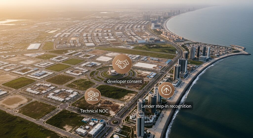 For a plot allocation, sublease, or building interest inside Eko Atlantic, we ask two questions on day one: will the developer/city management consent to this transfer or charge, and will they recognise the incoming lender or buyer if enforcement ever happens. We don’t wait until completion to ask. We put the forms in, get the consent fees and technical requirements, and table them in the SPA so both parties know what it costs.